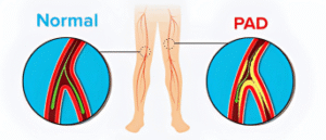 Peripheral artery disease (PAD) is a condition that occurs when arteries that supply blood flow to the arms and legs become constricted or obstructed. Consider the water pipes in your house as an analogy for your blood vessels. When they become blocked with deposits, water can no longer flow freely in such pipes. Similarly, when fats line your arteries, blood cannot reach the muscles and body organs as it should.